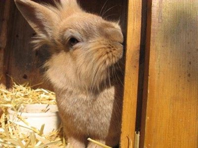 Beim Überfahren des Bildes sehen Sie ein Kaninchen mit dem Farbschlag Creme - Japaner mit breiter Blesse
